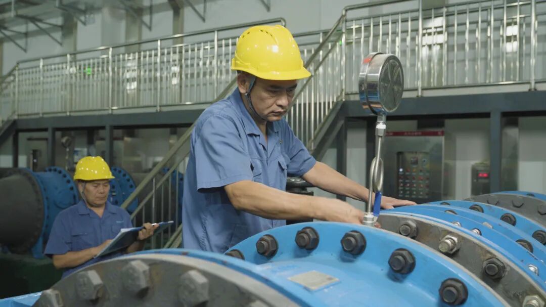 ? ? ? ?走進(jìn)泵房深處,許師傅正俯身檢修水泵機(jī)組。安全帽下的發(fā)絲被汗水浸濕,臉頰上濺著黑色機(jī)油,工作服已洗得發(fā)白,肘部磨出毛邊——這些都是他二十年檢修生涯的印記。