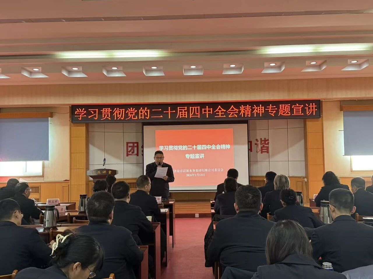 ? ? ? ?1月13日,濟(jì)南市清源水務(wù)集團(tuán)有限公司黨委組織學(xué)習(xí)貫徹黨的二十屆四中全會(huì)精神專題宣講。黨委書記、董事長魏長學(xué)作宣講報(bào)告,黨委副書記、董事、總經(jīng)理金強(qiáng)主持會(huì)議,集團(tuán)公司領(lǐng)導(dǎo)、各職能部室主要負(fù)責(zé)人及各黨支部書記、支委成員、黨員、入黨積極分子、群眾、統(tǒng)戰(zhàn)對象代表參加學(xué)習(xí)。